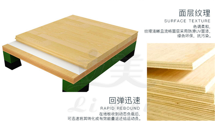 稳定层是体育木地板的上层,它对板材的基本请求平时是接纳大幅面的质料,可选定地局限平时为OSB板大概是胶合板,平时来说它的厚度需求在12mm以上,而它的大小尺寸基本1.22*2.44m